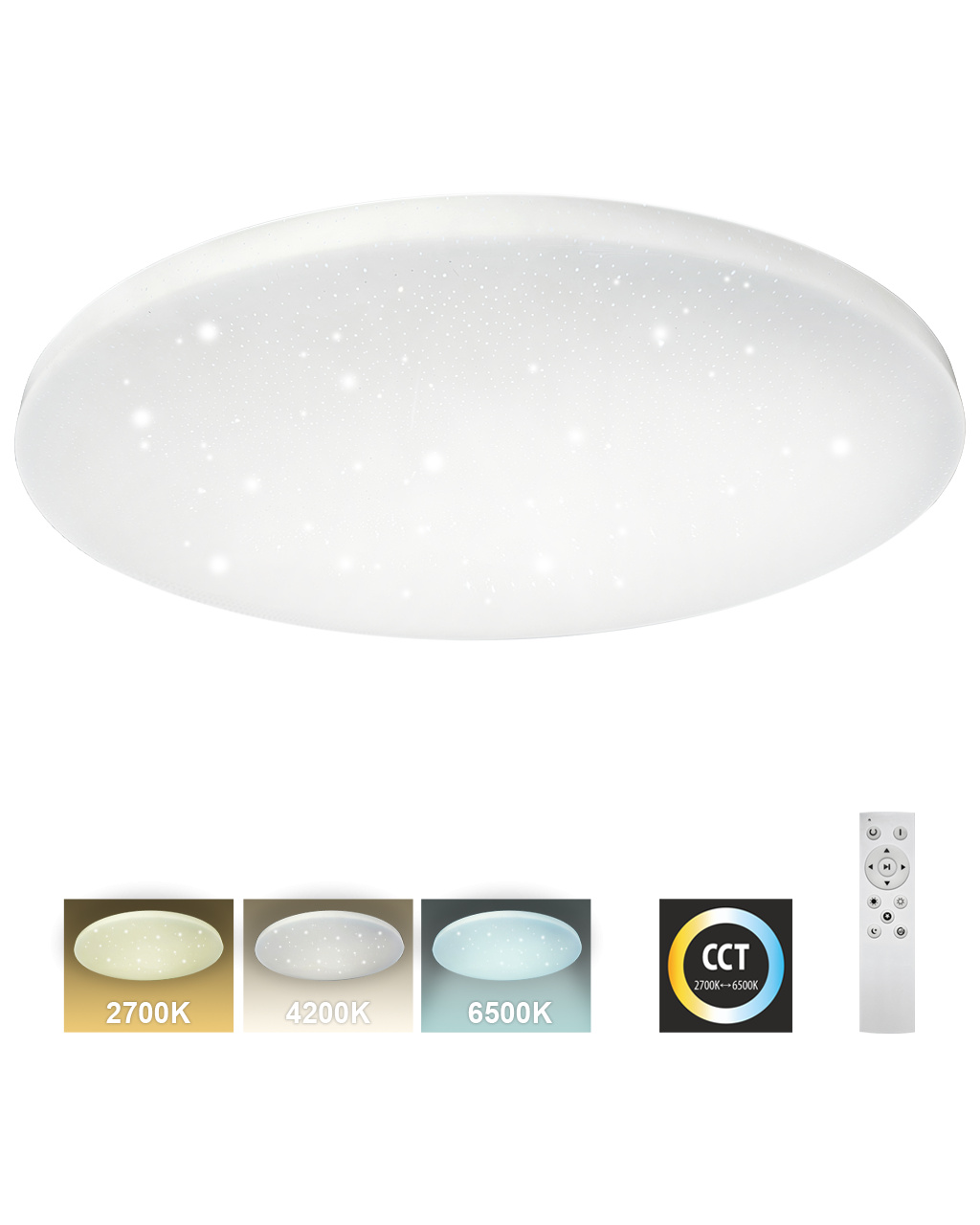 LED stropní svítidlo TR-603C - IPOLY Trixline v bílé barvě se třpytivým efektem je určeno do vnitřních prostor jako jsou obývací pokoje, ložnice, haly, kanceláře, chodby a podobná místa. Pomocí přiloženého ovladače můžete přepínat mezi třemi světelnými teplotami v rozmezí 2700K až 6500K, které lze stmívat dle potřeby pro navození příjemné atmosféry. Při maximálním ztlumení klesá spotřeba až na pouhých 14W z původních 80W, což zaručuje úsporu energie. Další možností na dálkovém ovladači je i noční režim a funkce 30 vteřin po jejichž uplynutí se LED svítidlo samo vypne. Svítidlo si po vypnutí pamatuje poslední nastavený režim, což zajišťuje pohodlné a intuitivní používání.