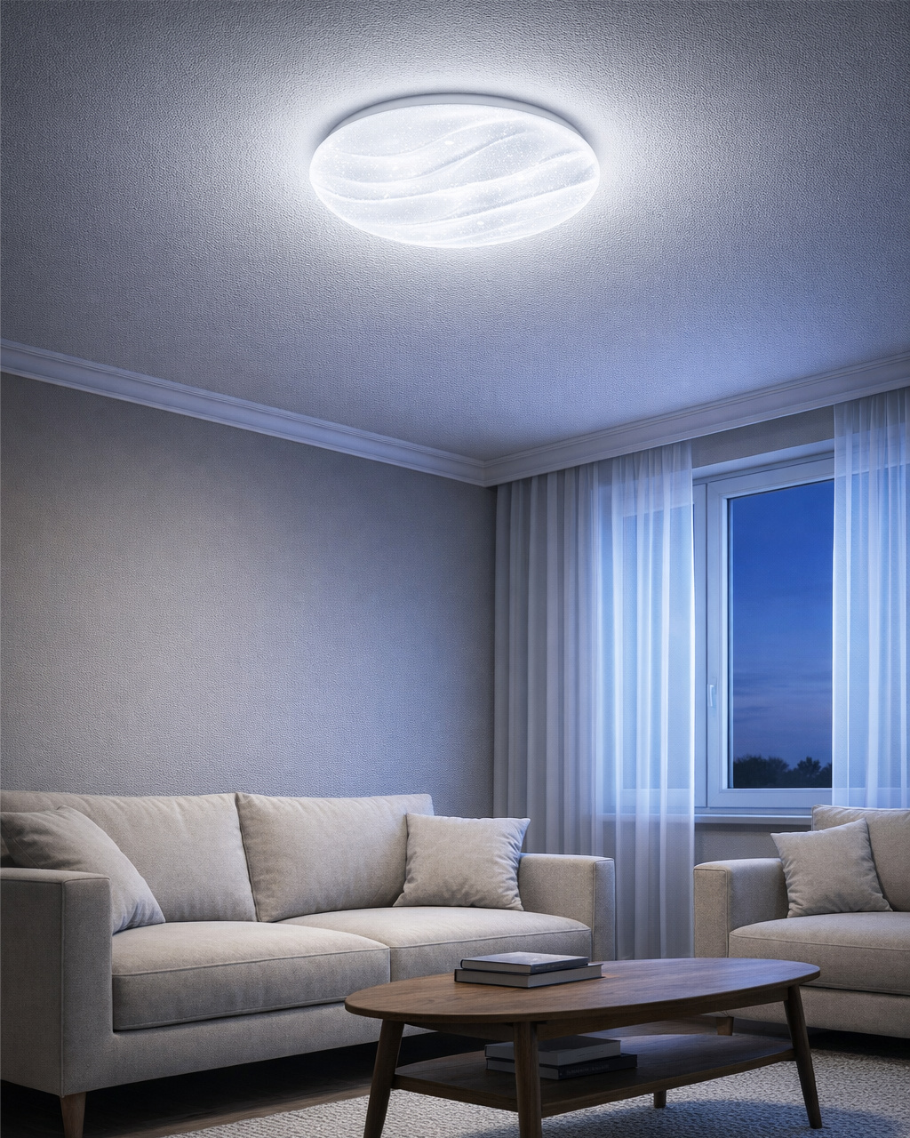 LED stropní svítidlo TR-606C - LIKA Trixline v bílé barvě se třpytivým efektem je určeno do vnitřních prostor jako jsou obývací pokoje, ložnice, haly, kanceláře, chodby a podobná místa. Pomocí přiloženého ovladače můžete přepínat mezi třemi světelnými teplotami v rozmezí 2700K až 6500K, které lze stmívat dle potřeby pro navození příjemné atmosféry. Při maximálním ztlumení klesá spotřeba až na pouhých 6W z původních 36W, což zaručuje úsporu energie. Další možností na dálkovém ovladači je i noční režim a funkce 30 vteřin po jejichž uplynutí se LED svítidlo samo vypne. Svítidlo si po vypnutí pamatuje poslední nastavený režim, což zajišťuje pohodlné a intuitivní používání.