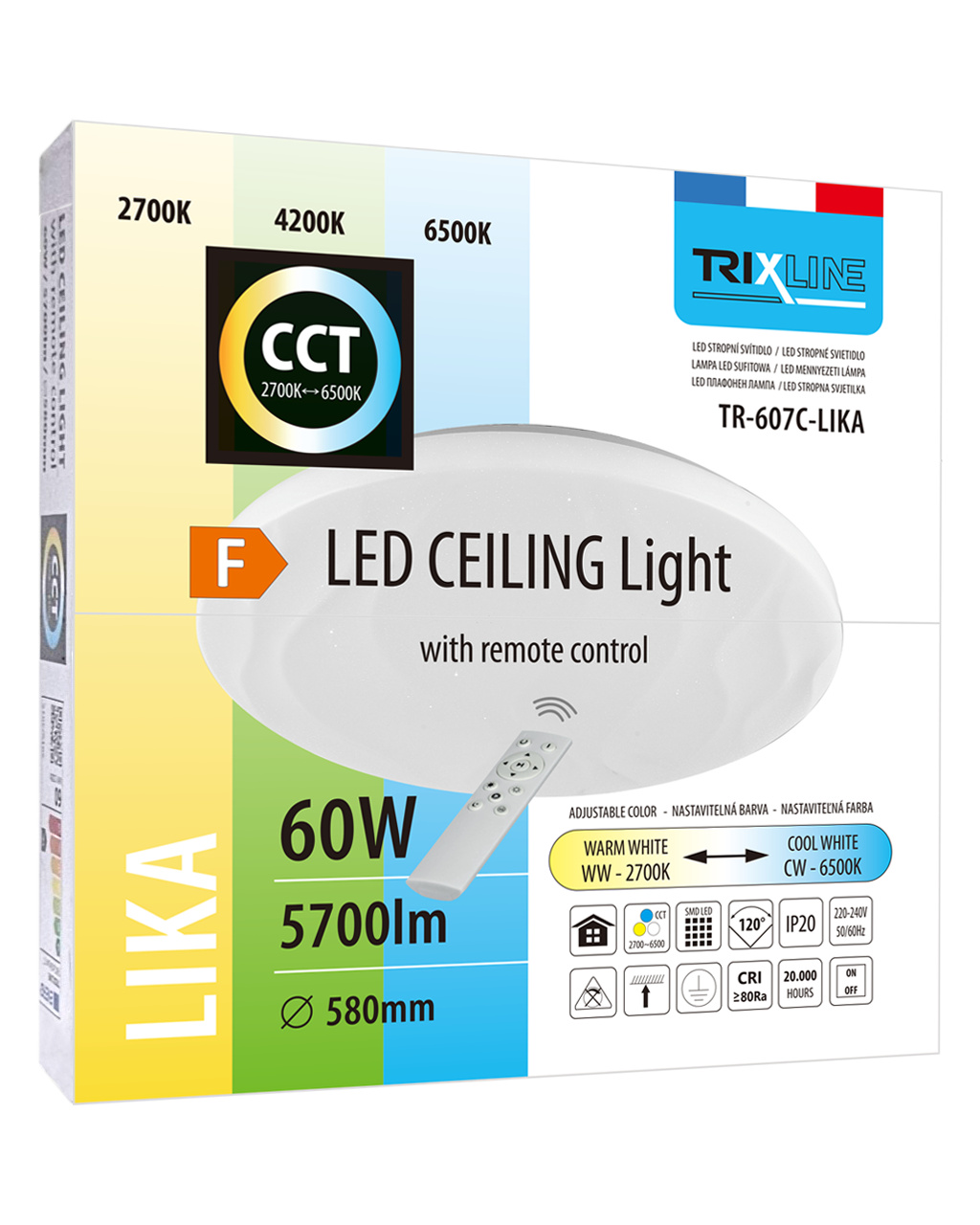 LED stropní svítidlo TR-607C - LIKA Trixline v bílé barvě se třpytivým efektem je určeno do vnitřních prostor jako jsou obývací pokoje, ložnice, haly, kanceláře, chodby a podobná místa. Pomocí přiloženého ovladače můžete přepínat mezi třemi světelnými teplotami v rozmezí 2700K až 6500K, které lze stmívat dle potřeby pro navození příjemné atmosféry. Při maximálním ztlumení klesá spotřeba až na pouhých 8W z původních 60W, což zaručuje úsporu energie. Další možností na dálkovém ovladači je i noční režim a funkce 30 vteřin po jejichž uplynutí se LED svítidlo samo vypne. Svítidlo si po vypnutí pamatuje poslední nastavený režim, což zajišťuje pohodlné a intuitivní používání.