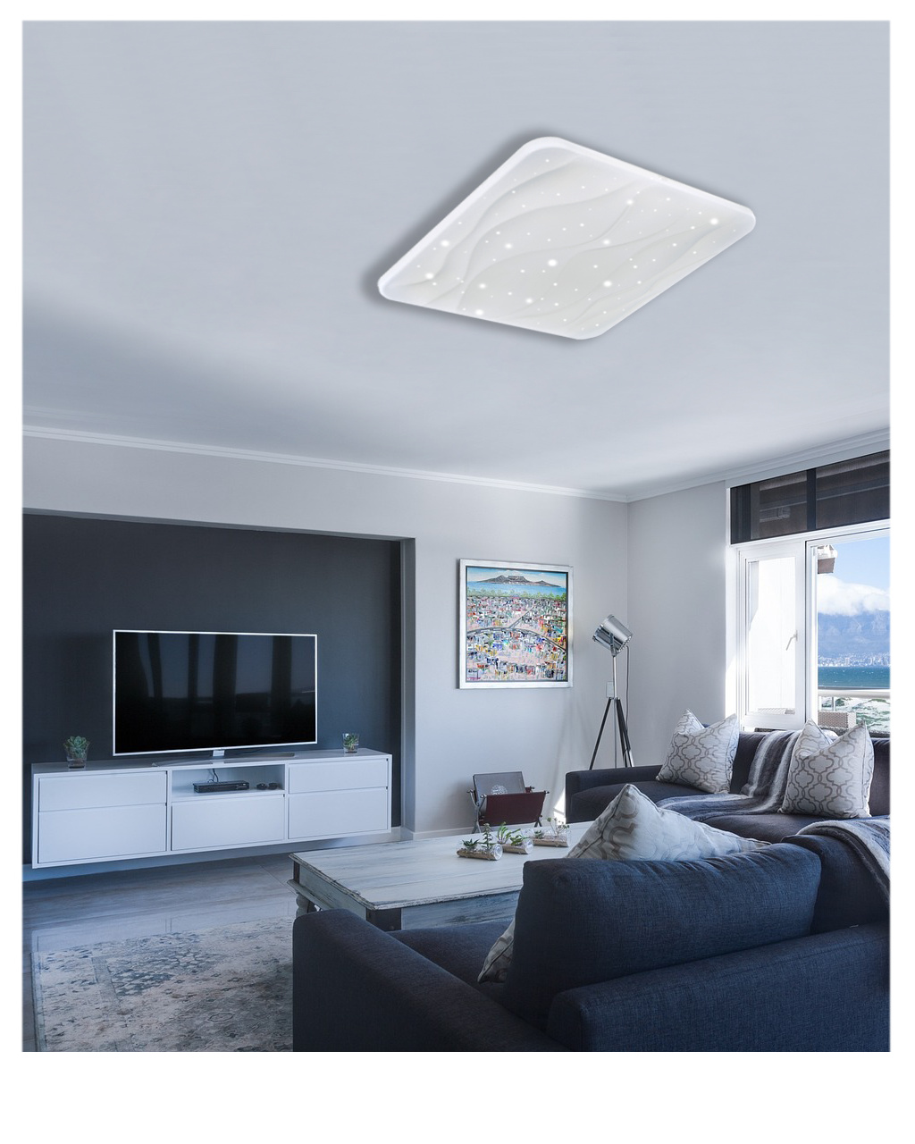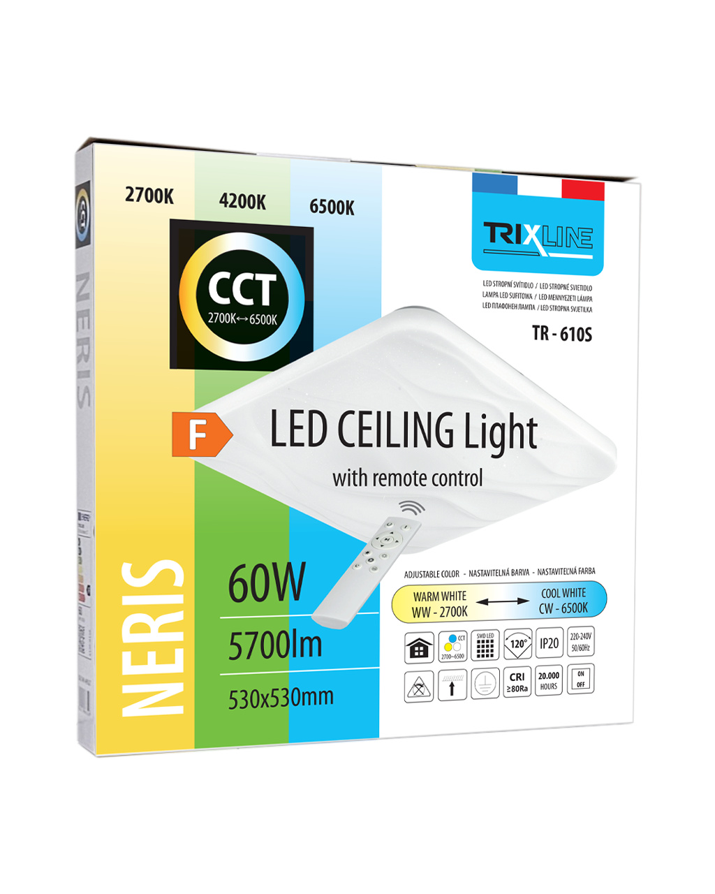 LED stropní svítidlo TR-610S - NERIS Trixline v bílé barvě se třpytivým efektem je určeno do vnitřních prostor jako jsou obývací pokoje, ložnice, haly, kanceláře, chodby a podobná místa. Pomocí přiloženého ovladače můžete přepínat mezi třemi světelnými teplotami v rozmezí 2700K až 6500K, které lze stmívat dle potřeby pro navození příjemné atmosféry. Při maximálním ztlumení klesá spotřeba až na pouhých 8W z původních 60W, což zaručuje úsporu energie. Další možností na dálkovém ovladači je i noční režim a funkce 30 vteřin po jejichž uplynutí se LED svítidlo samo vypne. Svítidlo si po vypnutí pamatuje poslední nastavený režim, což zajišťuje pohodlné a intuitivní používání.