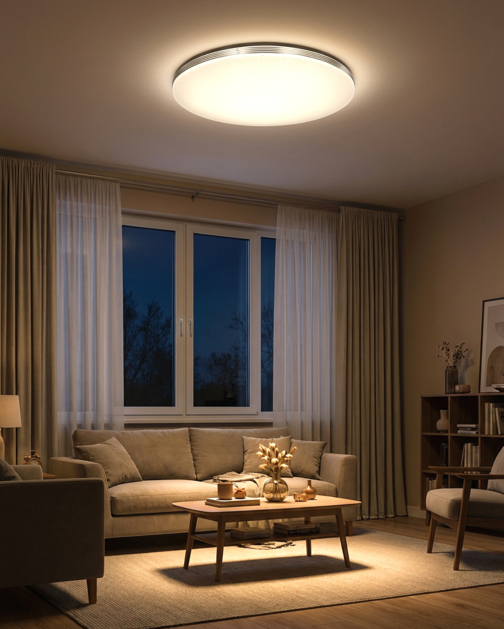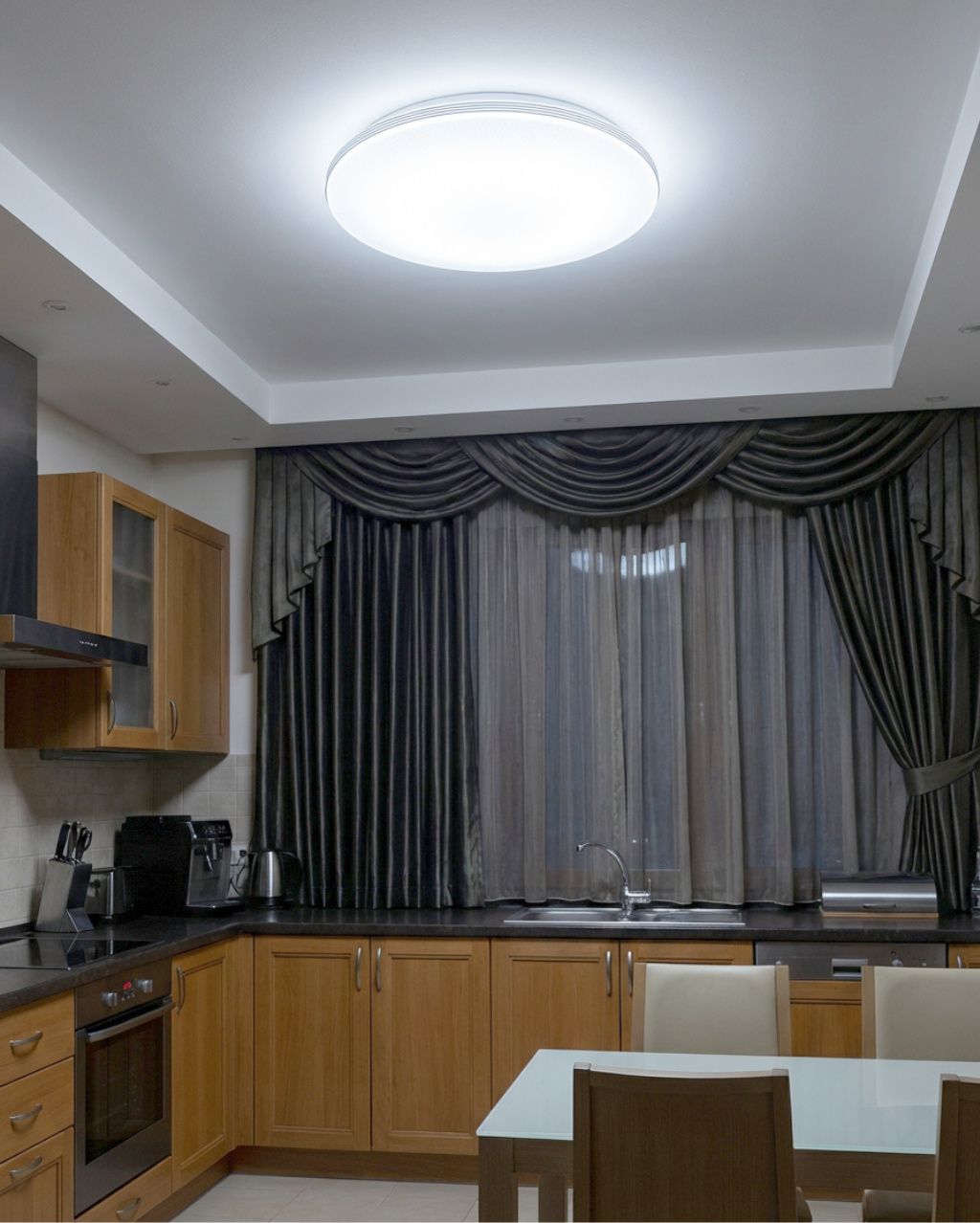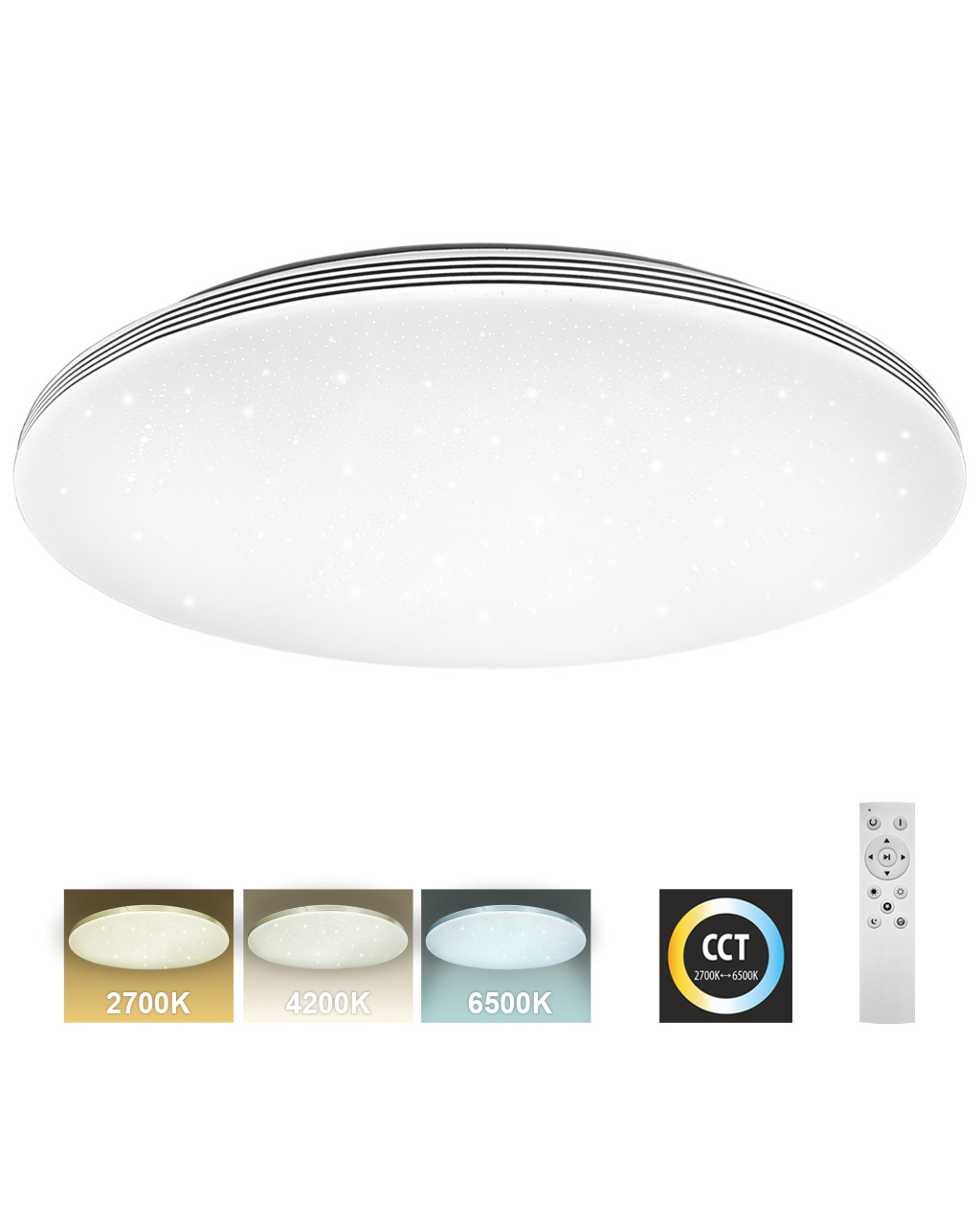 LED stropní svítidlo TR-613C - LIKA Trixline v bílé barvě se čtyřmi stříbrnými proužky po obvodu a třpytivým světelným efektem. Svítidlo má variabilní design, kdy můžete odejmout stříbrné proužky a ponechat pouze čistě bílé okraje. Je určeno do vnitřních prostor jako jsou obývací pokoje, ložnice, haly, kanceláře, chodby a podobná místa. Pomocí přiloženého ovladače můžete přepínat mezi třemi světelnými teplotami v rozmezí 2700K až 6500K, které lze stmívat dle potřeby pro navození příjemné atmosféry. Při maximálním ztlumení klesá spotřeba až na pouhých 14W z původních 80W, což zaručuje úsporu energie. Další možností na dálkovém ovladači je i noční režim a funkce 30 vteřin po jejichž uplynutí se LED svítidlo samo vypne. Svítidlo si po vypnutí pamatuje poslední nastavený režim, což zajišťuje pohodlné a intuitivní používání.