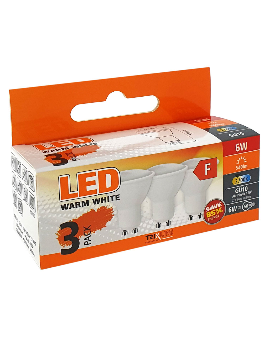 BODOVÉ LED ŽÁROVKY TRIXLINE ve výhodném balení po 3 kusech. Úsporná LED žárovka s paticí GU10 je šetrná k životnímu prostředí, neobsahuje žádnou rtuť ani olovo. Na rozdíl od vláknových žárovek se osvědčuje i při extrémně nízkých a vysokých teplotách. Její životnost dosahuje až 30 000 hodin. Díky svému výkonu 6W výborně poslouží jako náhrada za klasickou 50W žárovku. LED žárovka se po zapnutí okamžitě rozsvítí bez jakékoliv prodlevy a vyzařuje příjemné teplé bílé světlo 2700K. Žárovku můžete použít v ložnici, obývacím pokoji apod.