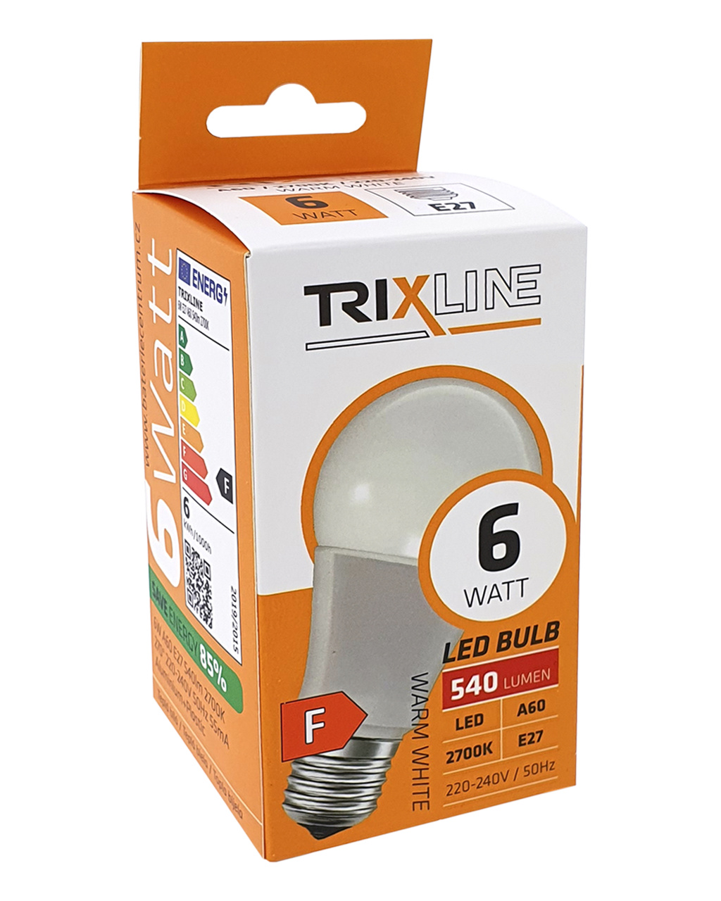 ŻARÓWKA LED TRIXLINE to oszczędna żarówka LED z gwintem E27, przyjazna dla środowiska, ponieważ nie zawiera rtęci ani ołowiu, ponadto sprawdza się dobrze nawet przy ekstremalnie niskich i wysokich temperaturach, gdzie żarówki z włóknem często mają problemy.Jej żywotność sięga aż 30 000 godzin.Dzięki swojej mocy 6W doskonale sprawdzi się jako zamiennik dla klasycznej żarówki 51W. Żarówka LED po włączeniu natychmiast się zapala bez jakiegokolwiek opóźnienia i emituje przyjemne ciepłe białe światło 2700K.