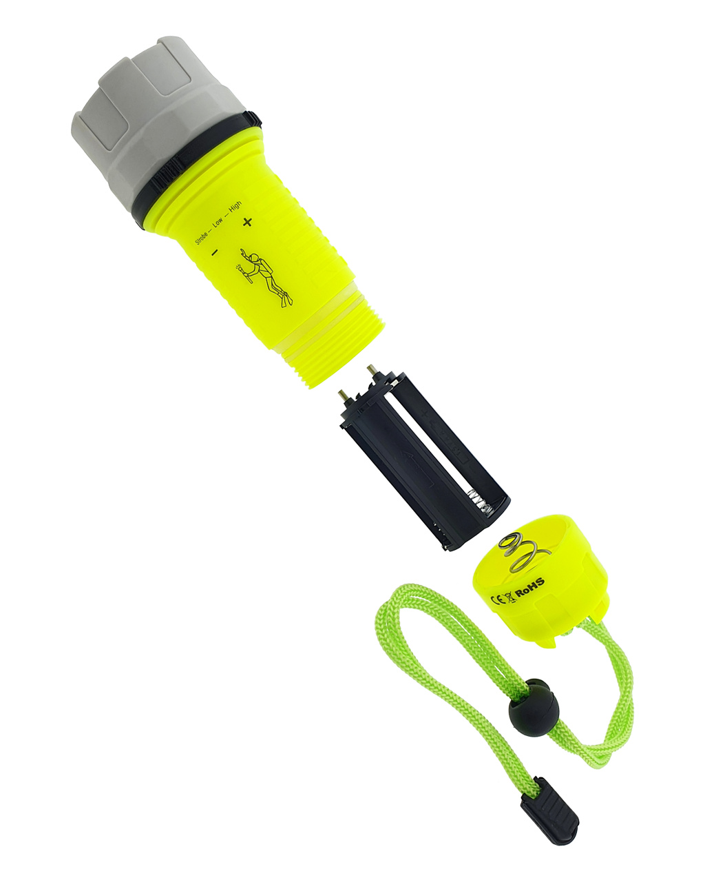 Ruční voděodolná svítilna vhodná pro potápění. Díky poutku ji bezpečně připevníte na ruku. Vybírat můžete ze tří módů svícení, vysoký jas, střední a blikání. Stupeň krytí IP68.