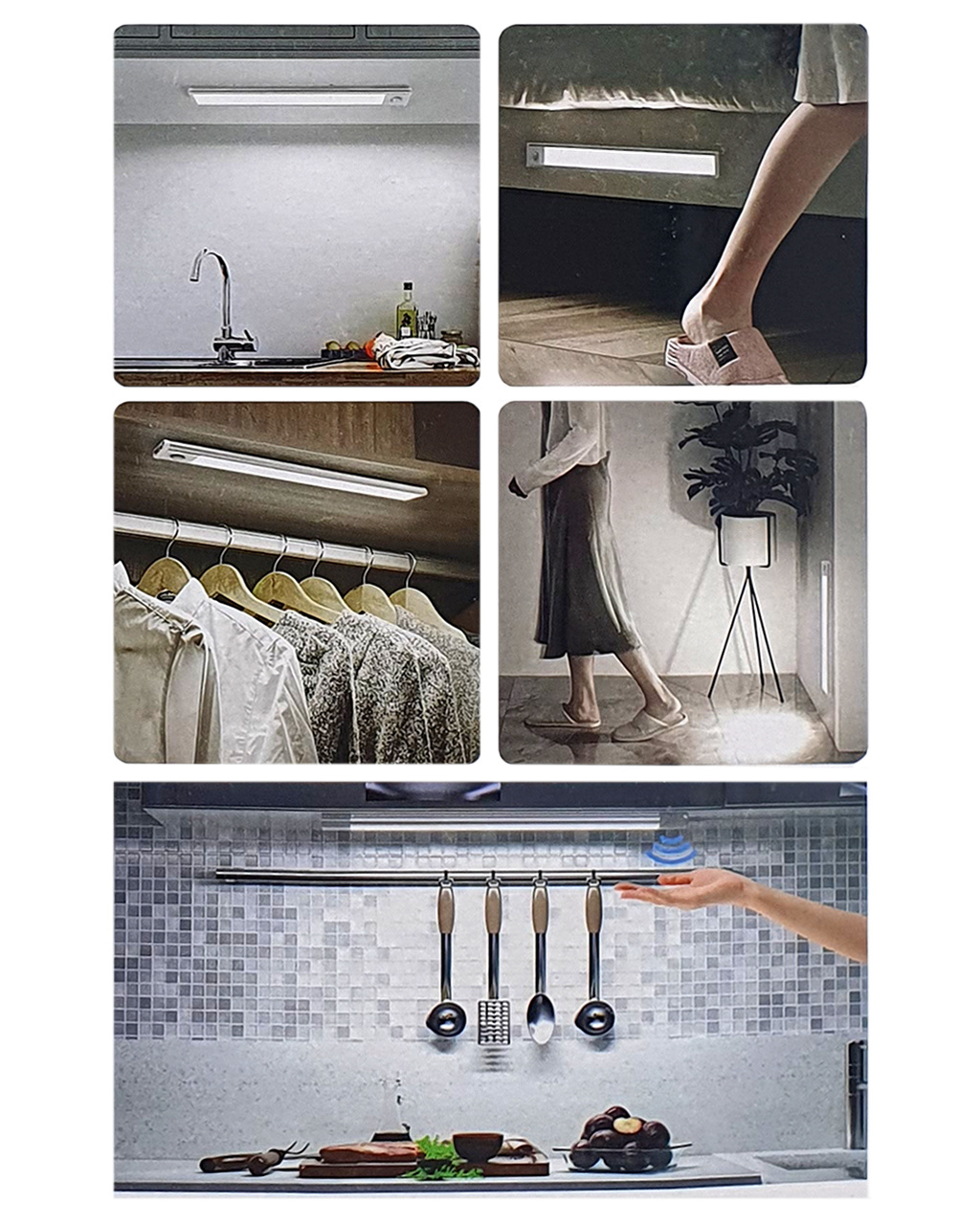 Automatické rozsvícení světla funguje pouze ve tmě. Nezapne se pod jasným světlem a ve dne. Na zadní straně jsou 2 magnetické proužky. Jeden opatřený oboustrannou lepící páskou a druhý upevněný ve světle. Senzorové noční světlo lze snadno přichytit např. do skříně, na police, rám postele, schodiště, pod kuchyňskou linku apod. Napájeno pomoci 4xAAA mikrotužkových alkalických baterií (nejsou součástí balení).