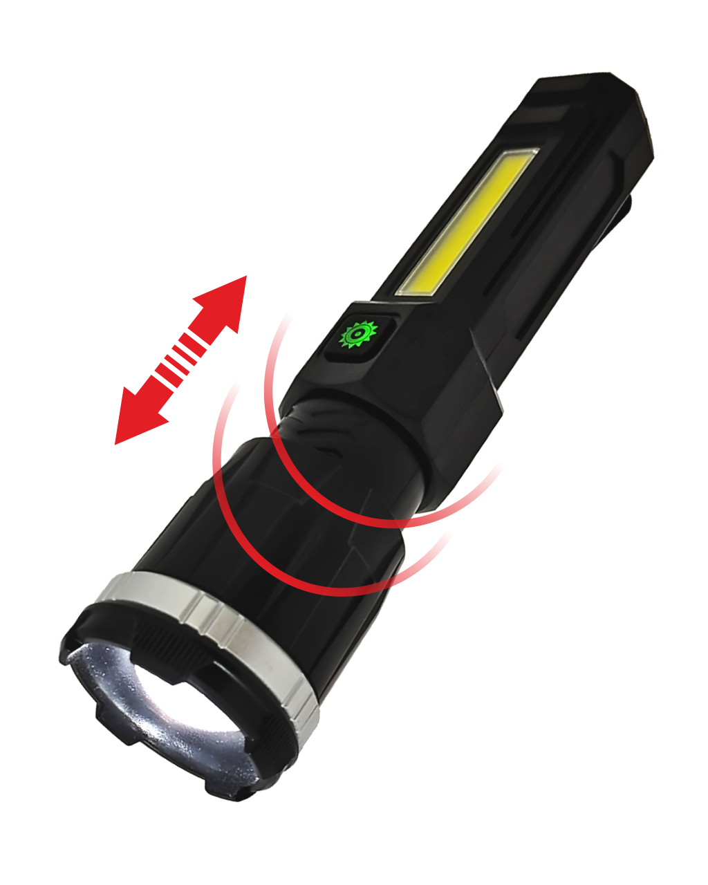 Svítilna nabízí proměnnou ohniskovou vzdálenost a tři režimy svícení – 100%, 50% a blikání – takže si můžete přizpůsobit intenzitu světla podle aktuální situace. Hlavní COB LED dioda se svítivostí 200lm a doplňkový boční LED panel se 100lm zajišťují dostatečné osvětlení pro široké využití.