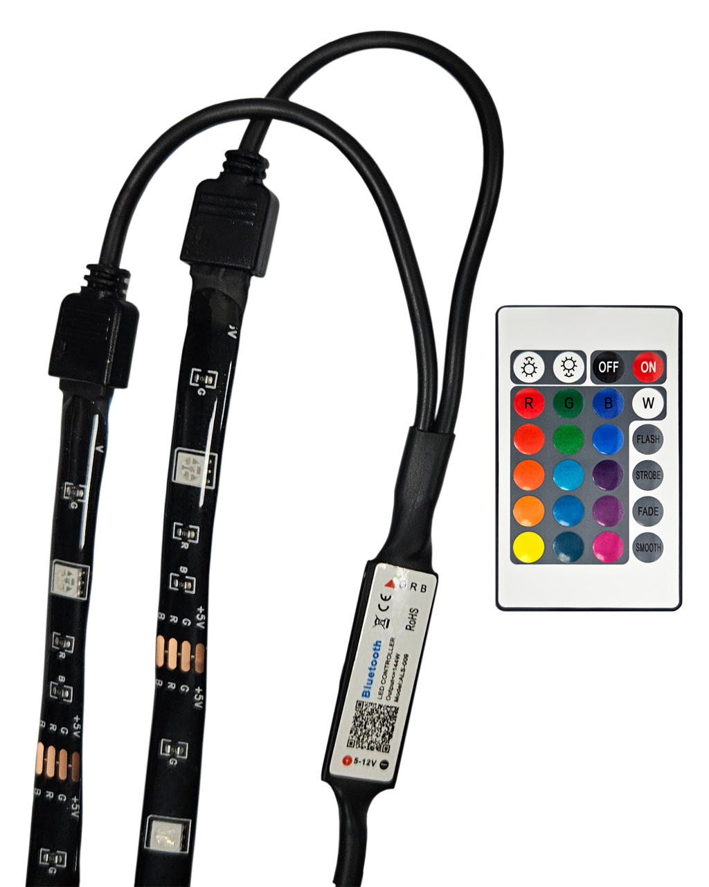 Dálkovým ovladačem můžete nastavit 16 barev, regulovat jas, blikání barev (flash), režim blednutí světla (strobe), režim blednutí barev (fade) a plynulý režim (smooth), zapnout/vypnout. Dosah dálkového ovládání je do 1m