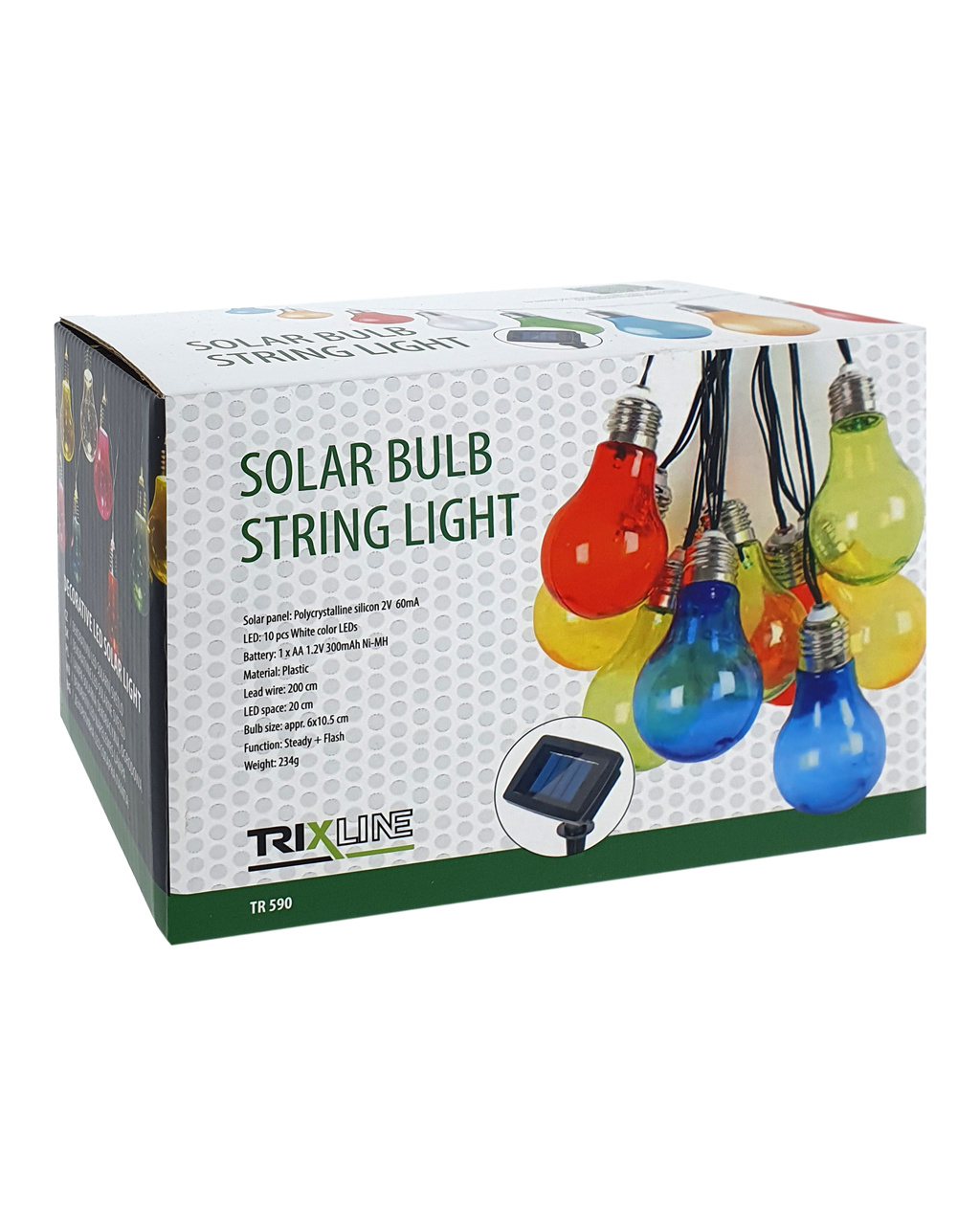 Dekorativní LED solární, venkovní osvětlení (řetěz/girlanda) TR-590 Trixline. Vytváří příjemnou atmosféru zahrady, pergoly, altánku, terasy, balkónu apod. Lze volně položit na stoly, parapety, police nebo zavěsit na zábradlí, ploty, zdi, slunečníky, stromy, sloupy, omotat na trámy nebo prověsy u stropu či volně do prostoru. Průhledný kabel o délce 2m je tvořen 10ti LED plastovými, barevnými žárovkami, vyzařují bílou barvu světla. Výhodou plastových žárovek oproti skleněným je jejich nerozbitnost, odolnost, nízká hmotnost a delší životnost. Díky solárnímu panelu ušetříte energii a nejste omezeni připojením do elektrické sítě. Ve dne se nabíjí a v noci rozsvítí. Má volitelné 2 režimy svícení (S) stabilní a (F) blikající.